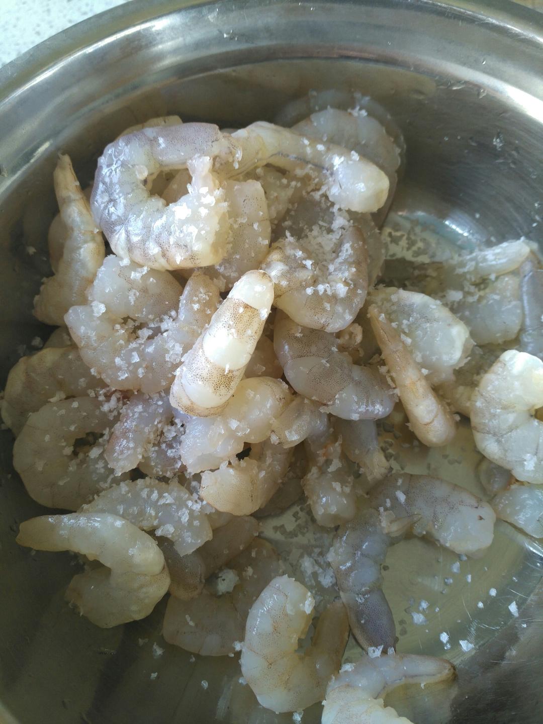这一步很重要,但很少有人知道。撒一把盐在洗净的虾仁里,顺一个方向搓揉,使盐融化。盐会让虾仁里多余的水份析出。还可以摩擦清洁虾的表面。盐融化后,用清水冲洗干净。可多次重复,使虾更美味。但必须冲洗干净,虾不可太咸。海虾本来就含有一点咸味的。