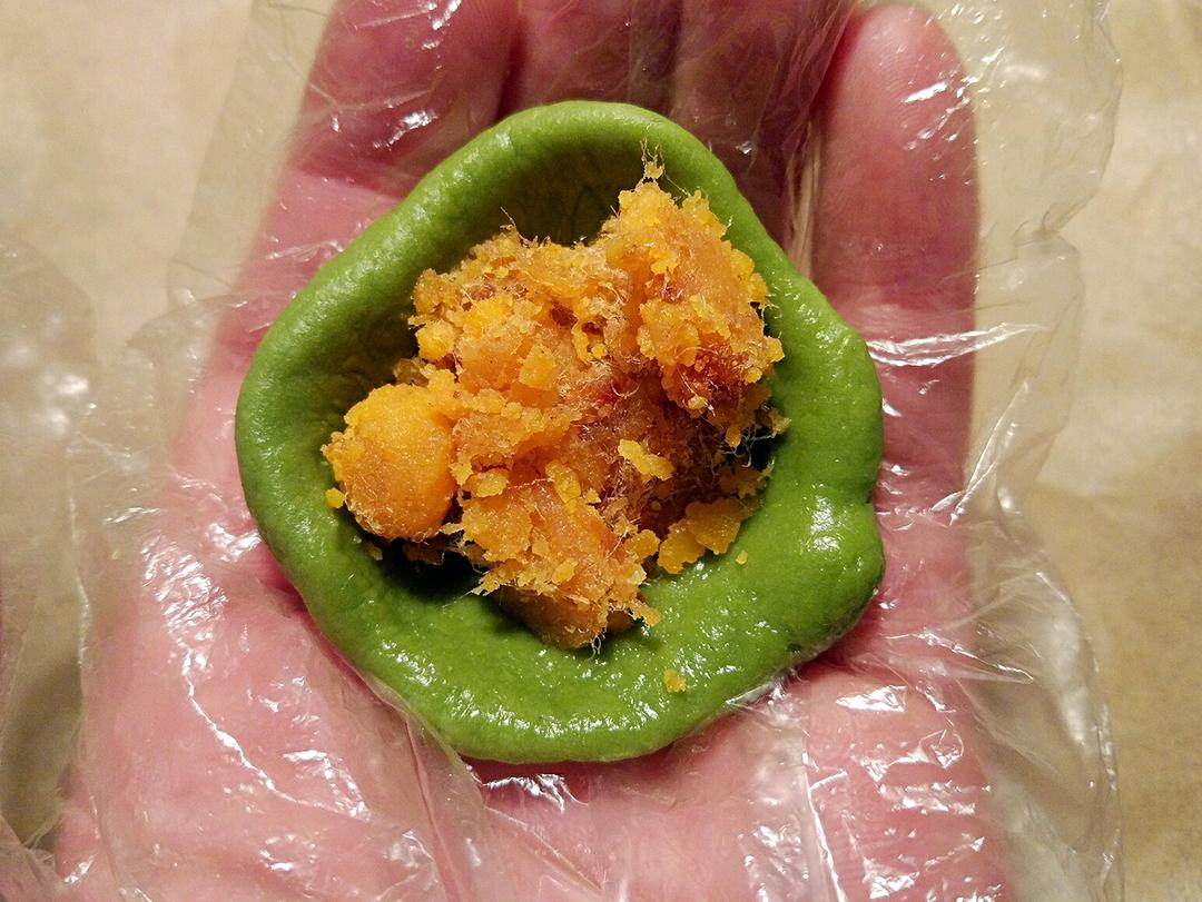 麻薯小球中包入咸蛋黄肉松馅(我没有海苔肉松,就先用肉松吧😜)