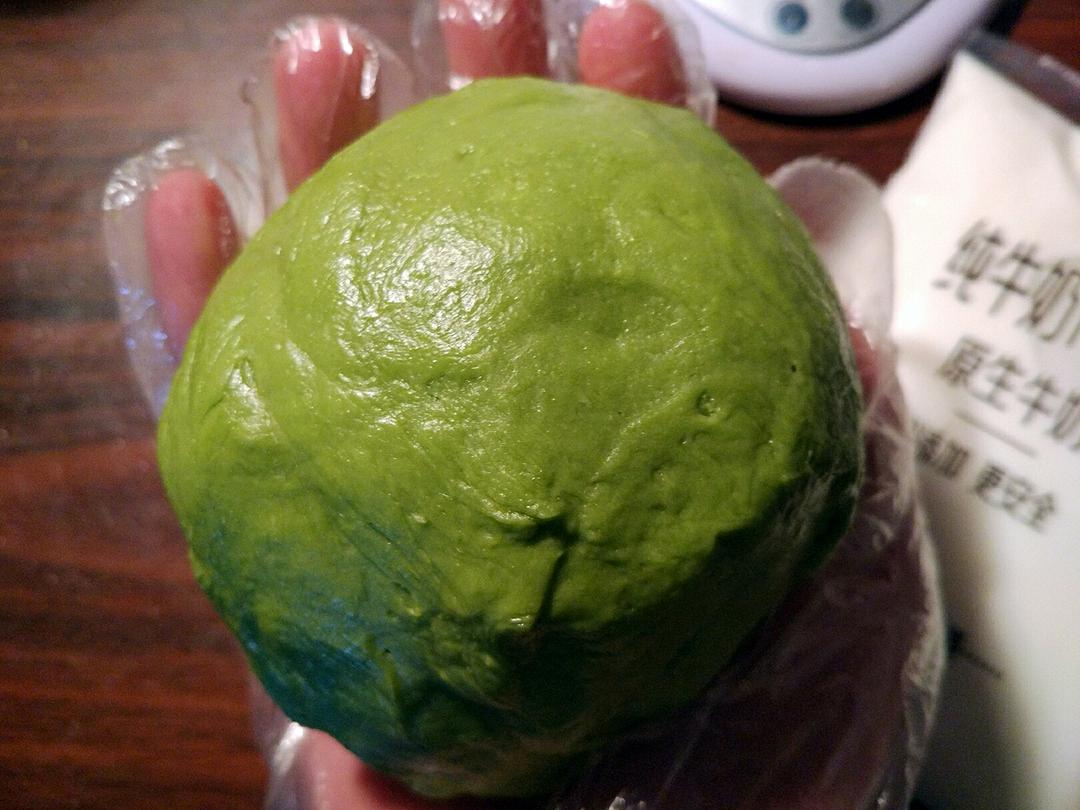 预拌粉中加入鸡蛋、牛奶、盐、抹茶粉拌匀(预拌粉中已经有糖,所以不需要额外再加糖)我有面包机,直接走一个饺子皮程序15分钟刚刚好😜(也可以加入黑芝麻之类自己喜欢的材料)