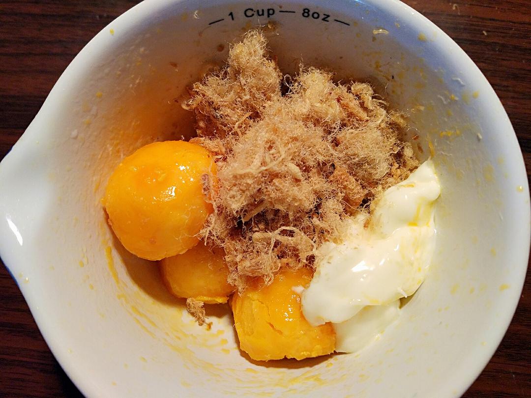 咸蛋黄隔水蒸熟(熟的可省略这步)加入肉松和沙拉酱拌匀(比例可以随自己喜好自由增减,沙拉酱主要起粘合作用,觉得热量高的可以替换成牛奶,只要馅混合起来不要太干太散就好)此时烤箱预热170度