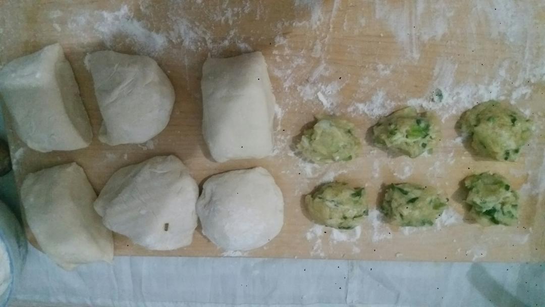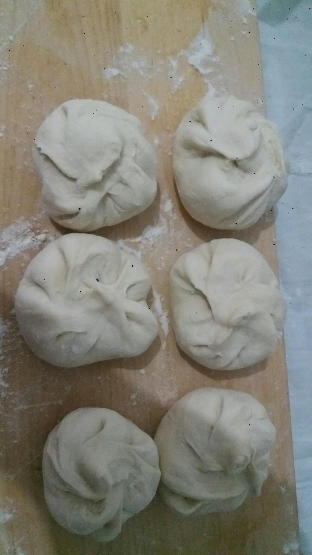 然后,从第一个包馅儿的面团开始,用擀面杖擀平