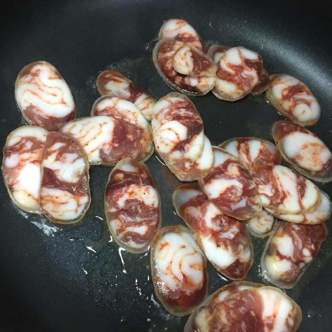 水已经干了 香肠开始出油了 加入蒜 一起炒香