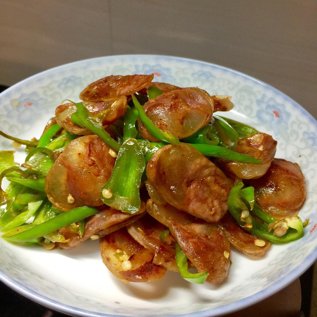 加入料酒 老妈买了一瓶这个福建老酒 最近给我迷上了 好像呀 煮肉菜 特别的香 这个时候加了酒香肠香喷喷软硬适中了 稍微就蒸发了 拨到一边 放青椒 加稍微一点点盐巴或者生抽调盐味 香肠不用加盐巴 不然就太咸了 青椒也要少加 不然太咸了