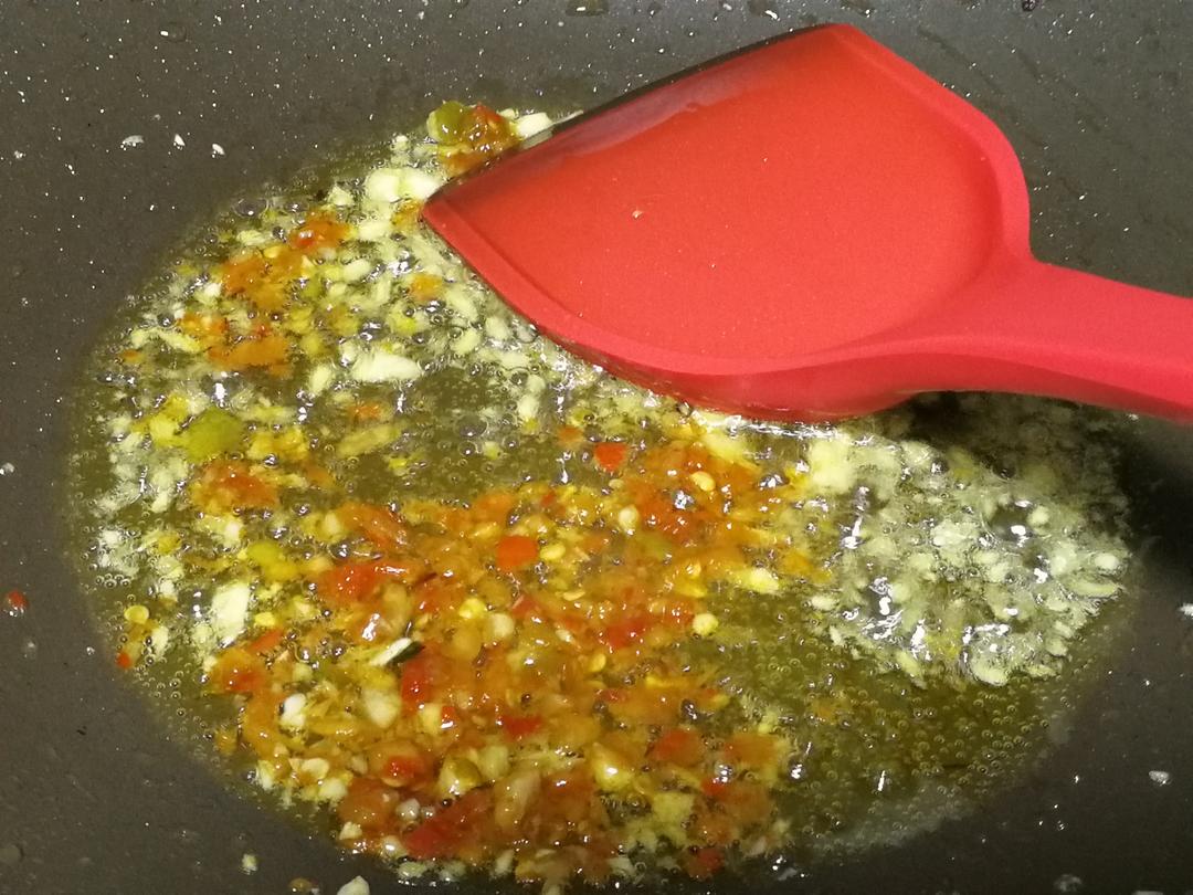 炒锅入油,爆香蒜蓉和剁椒