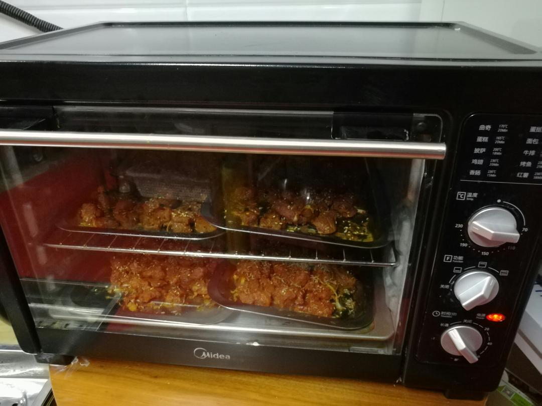烤盘刷油 平铺 我是高火烤10分钟 翻面再10分钟 肉就熟了 如果喜欢干点就多烤会