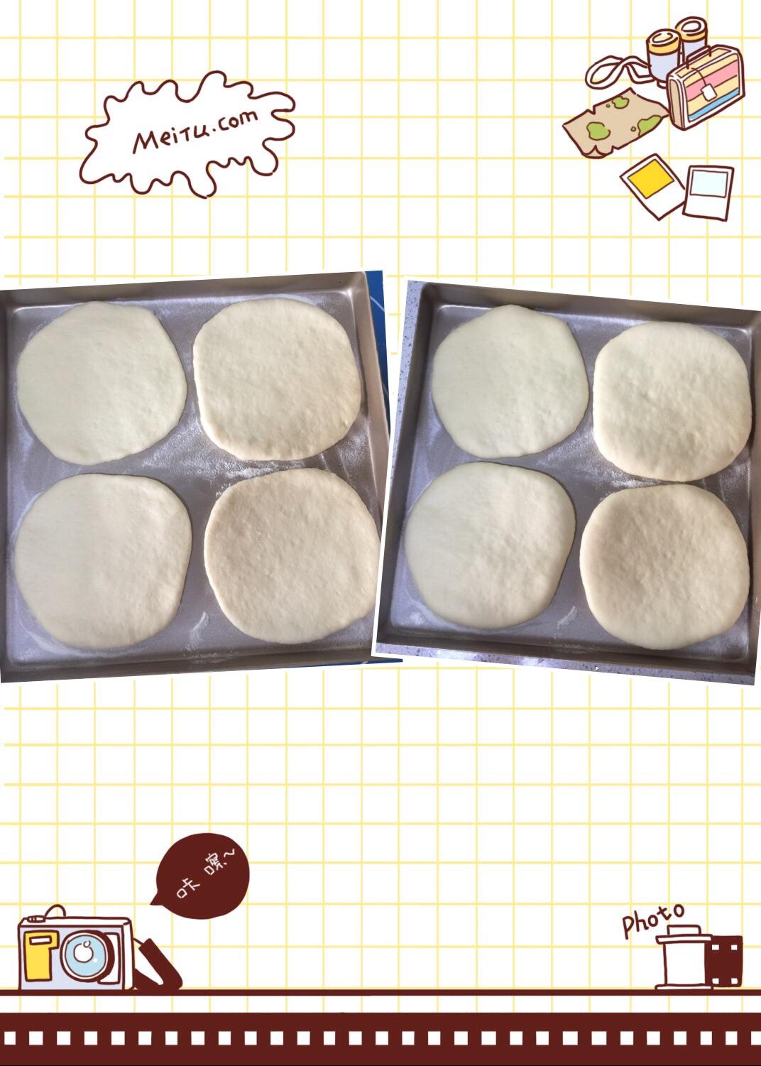 盘中撒干面粉防粘,最好垫油布或油纸,加盖毛巾二次发酵30分钟,饼胚变厚