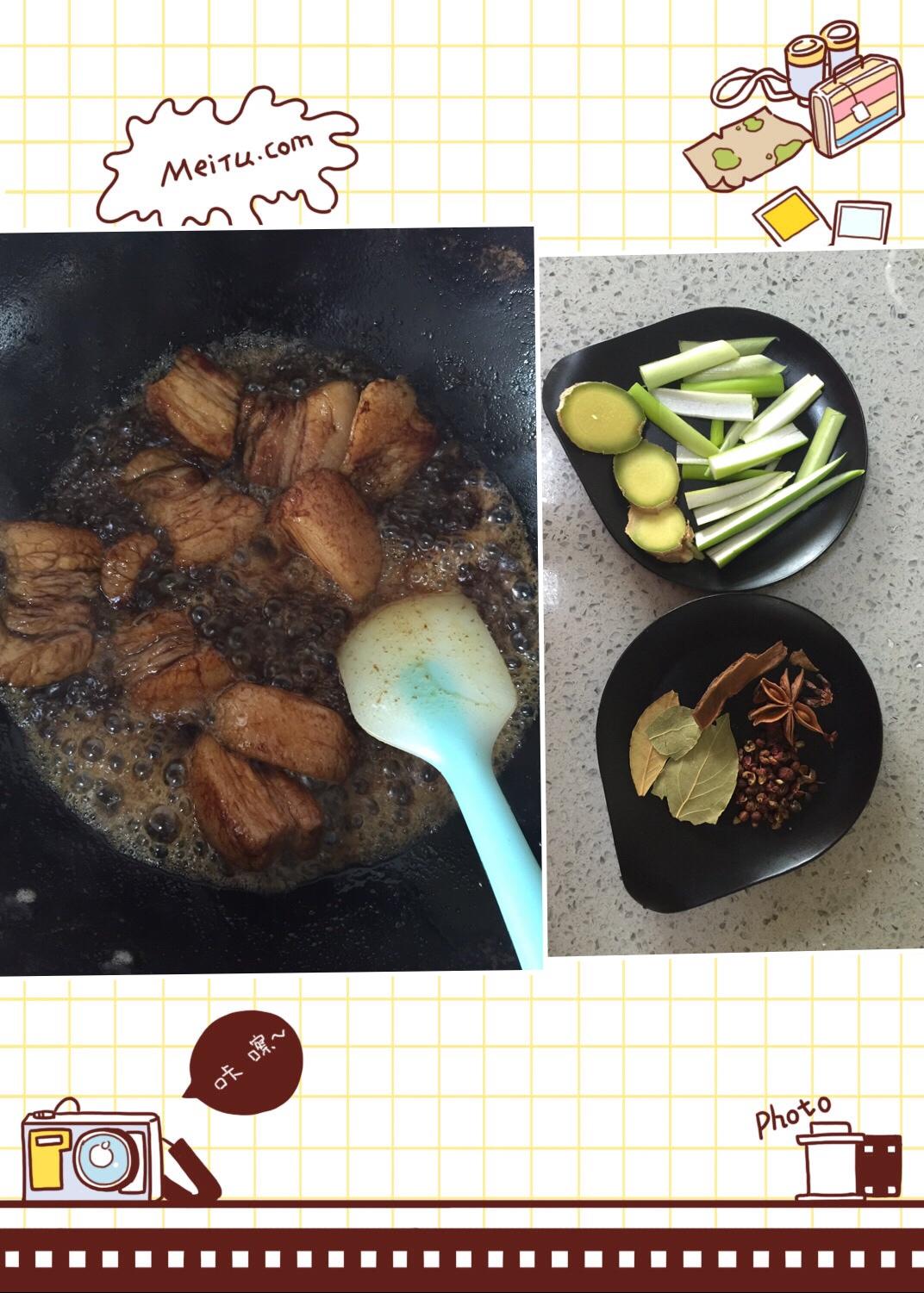 白糖刚有点变红加入肉翻炒,不要时间长会变成焦糖,这个步骤要小心,别被油溅到,因为肉里有水