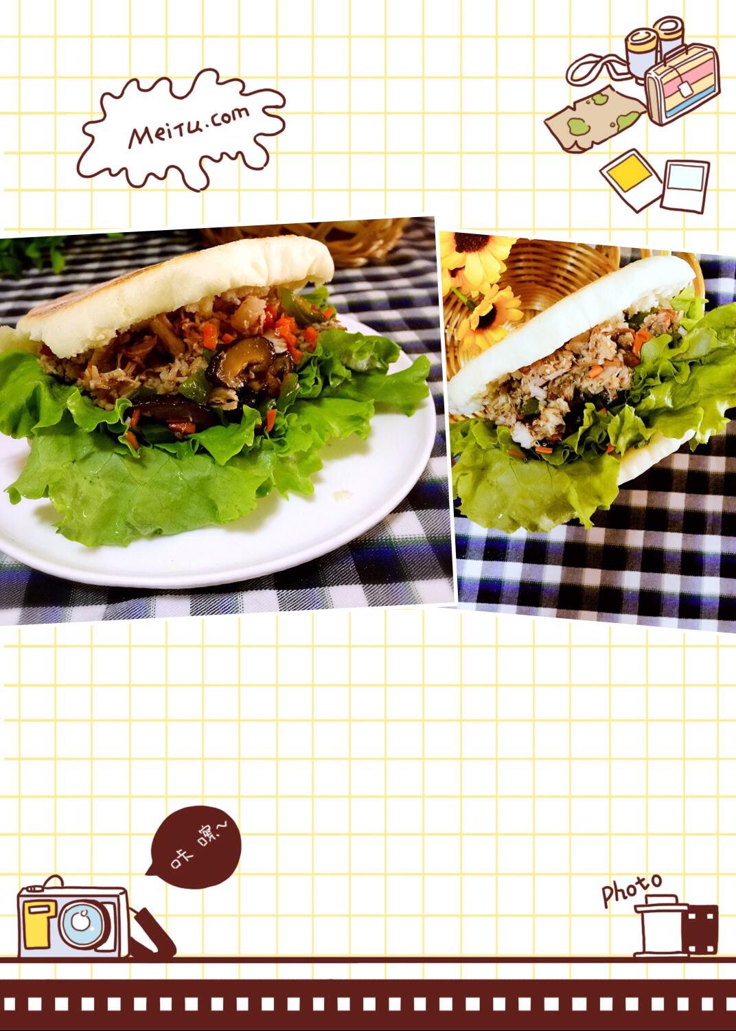 饼葱侧面切开,夹入生菜、肉和菜