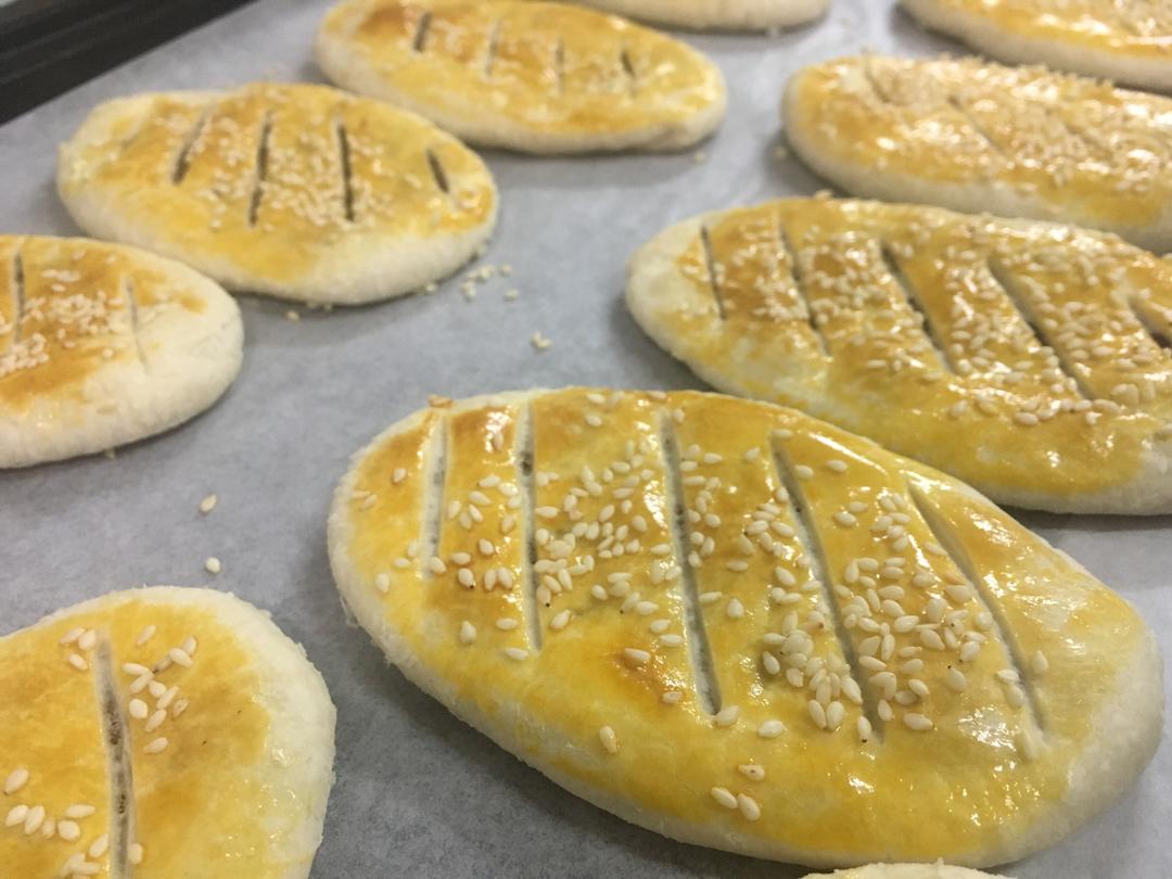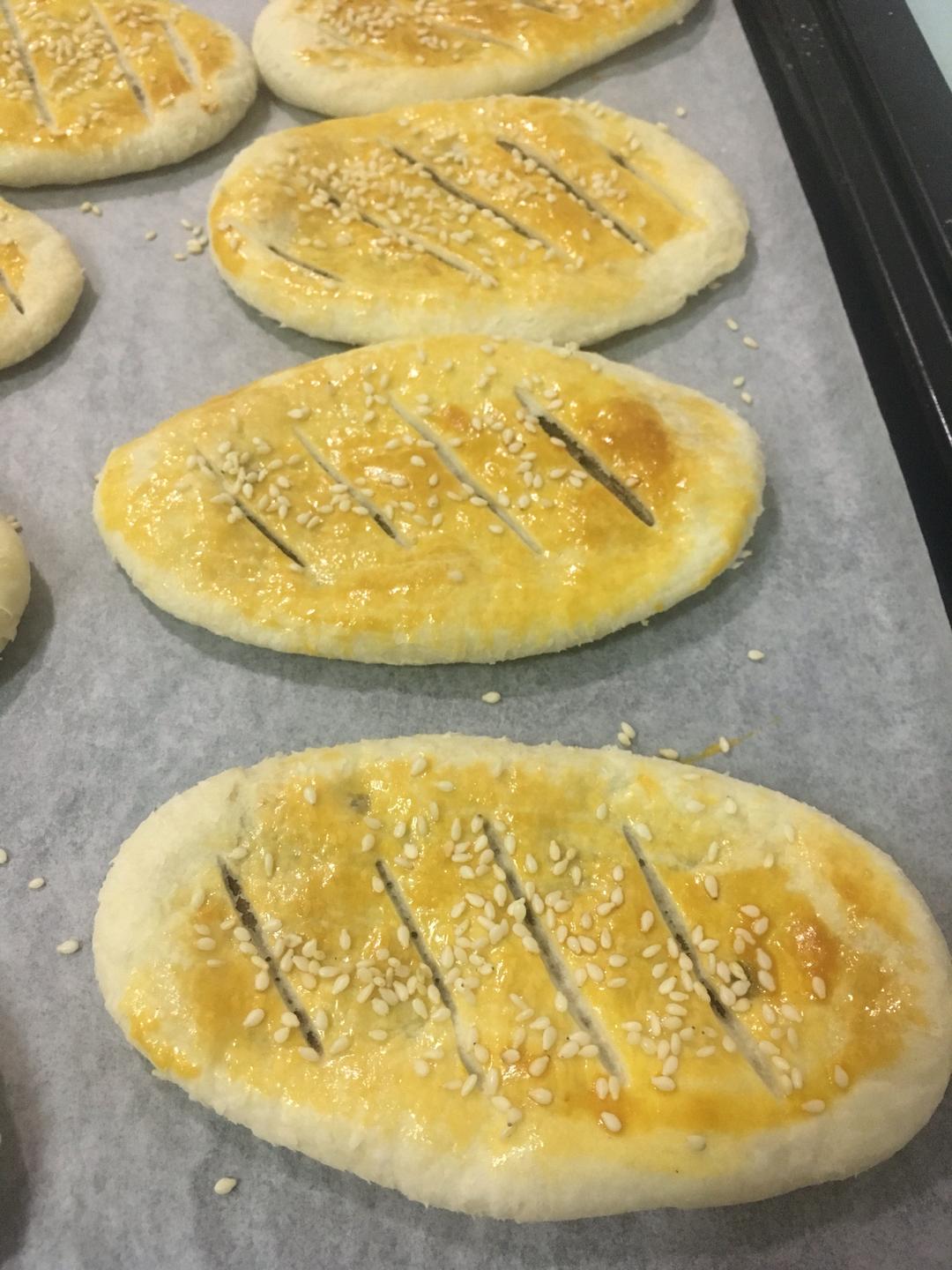 接着把它擀成圆形 把椒盐心包入 再擀成牛舌状 放入烤盘 刷上蛋黄液 撒上白芝麻 用小刀划几刀