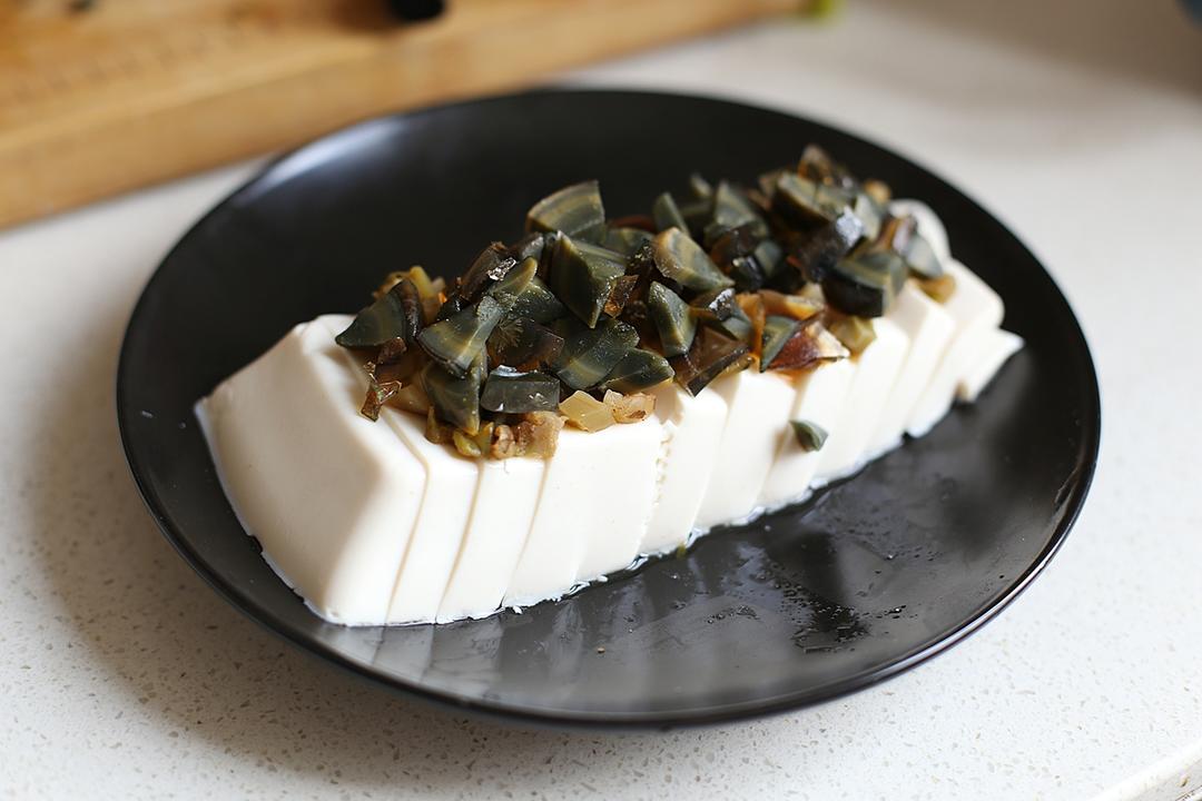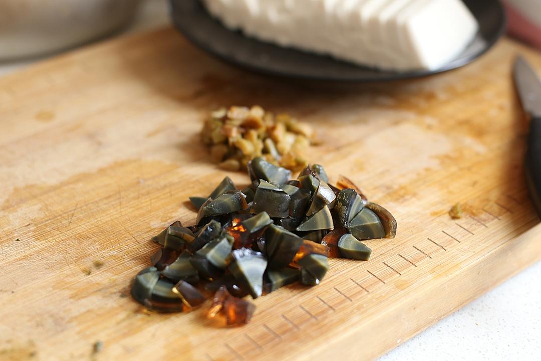 将切好皮蛋与榨菜码在豆腐上