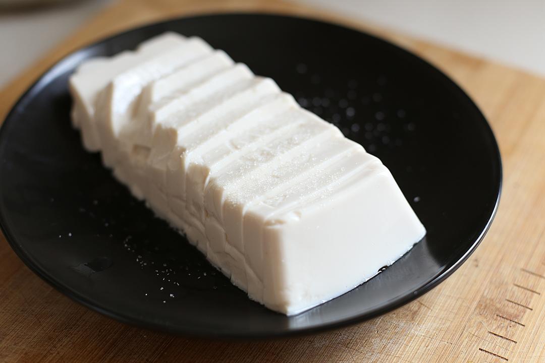 随后滤水,在豆腐表面撒一层薄盐静置10分钟待豆腐出水后倒去