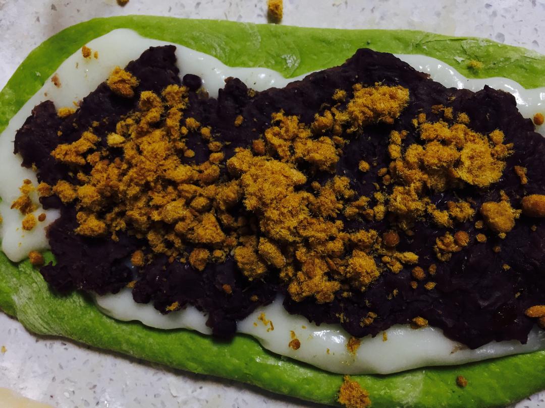 台面上撒干粉,将面团分成4份,排空气按扁,盖上保鲜膜松弛15分,将粘团擀成长方形,麻薯铺在面团上,在放一层红豆一层肉松,卷口收紧,一定要收紧,不然麻薯爆开,整成喜欢的形状,表面盖保险膜,放入烤箱烤发酵30分钟,两倍大。