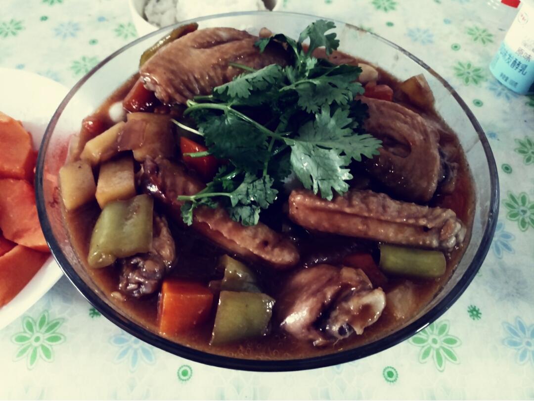 加酱汁。然后加入调好的酱汁,用铲子翻炒一下,让鸡翅和配菜都包裹上酱汁,再继续600度焖10分钟(若只有500度,则多焖5分钟为佳)。然后撒上着香菜,就可以出锅了!