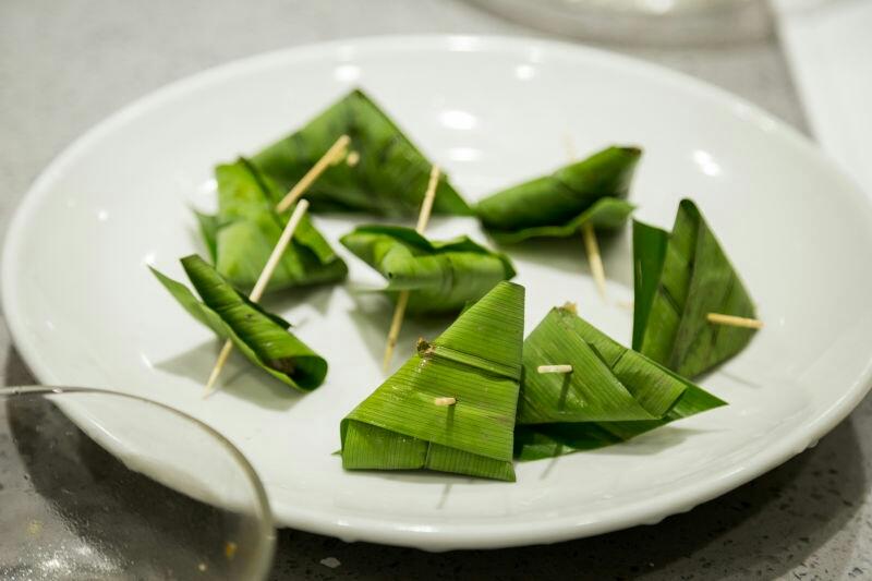 用香兰叶包鸡腿肉,像包粽子一样,用牙签固定,