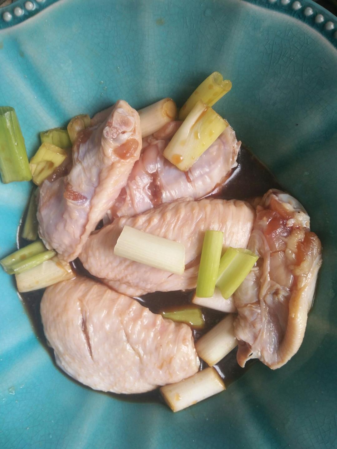 把鸡翅洗干净两面划刀,放生抽、老抽、料酒、盐、鸡精、葱姜蒜、黑胡椒粉抓匀腌制15分钟入味。
