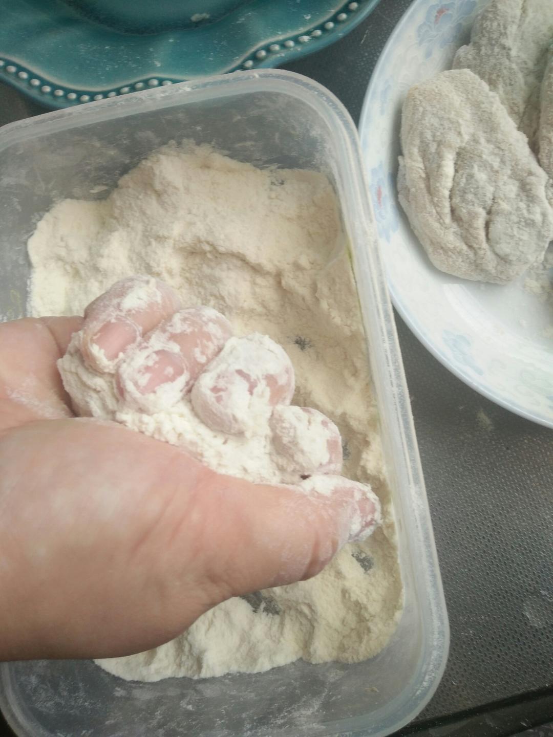 第二次裹面粉的时候用手使劲攥一下鸡翅,再在面粉里滚几遍面粉拿出备用。
