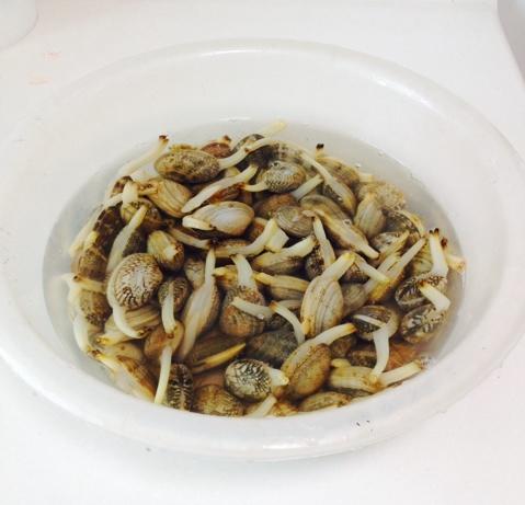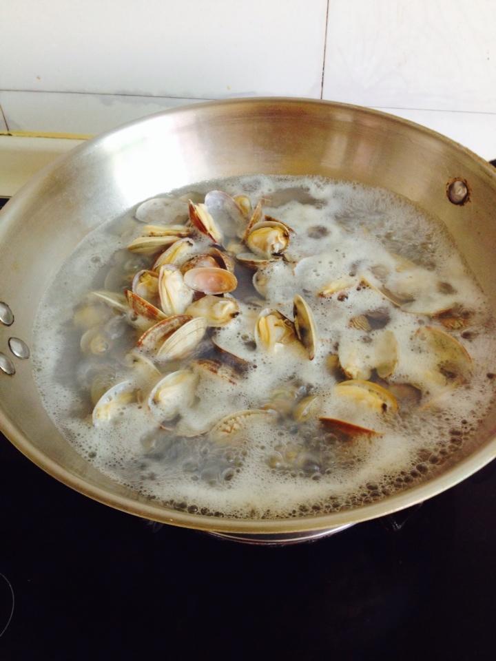 吐沙好了之后,我用牙刷一个个的刷蛤蜊外壳上面的黏液,再冲洗几次准备下锅。锅里水烧开下蛤蜊,约2-3分钟全部开口即捞出,如果煮了之后还没有开口的,那是死的,挑出来丢掉。煮的时间一定不要太长