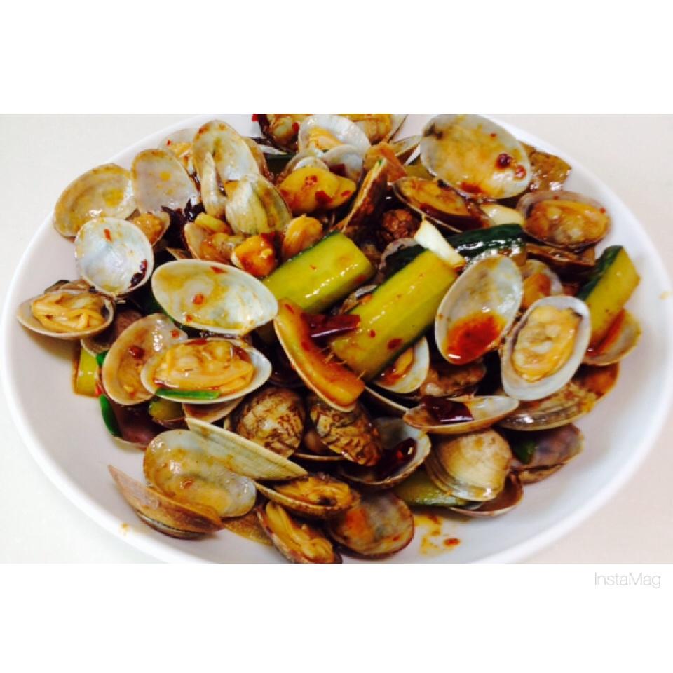 倒入黄瓜、蛤蜊进行翻炒,搅拌均匀之后,加盐倒入蚝油、生抽、料酒等等。翻炒至汤汁稍干出锅,时间不宜太长,肉老了就不太好吃