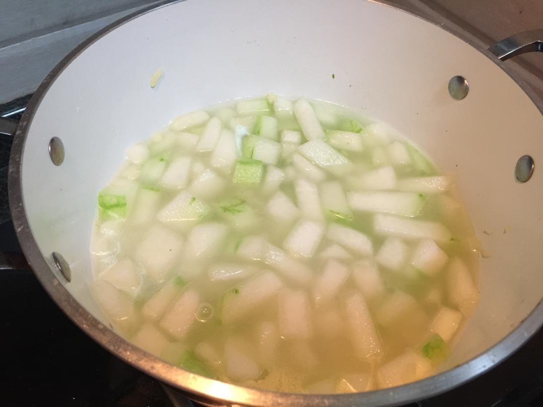 另起锅,热油放蒜片炒香,下冬瓜放点盐爆炒,再放一碗水去煮冬瓜,盖上锅盖让它煮软。