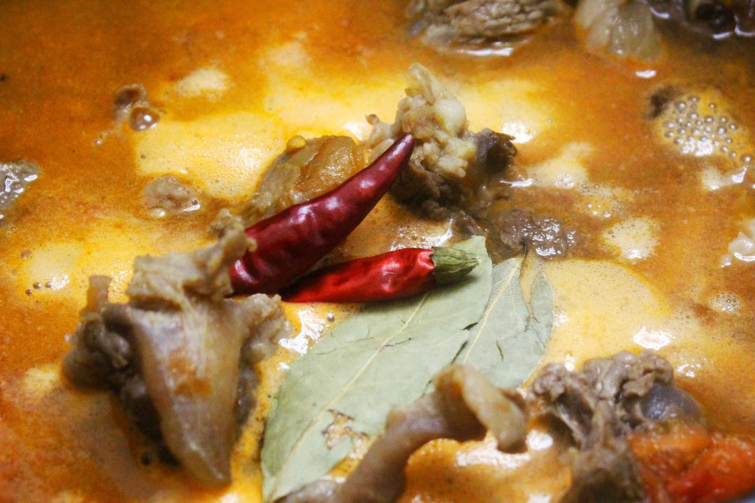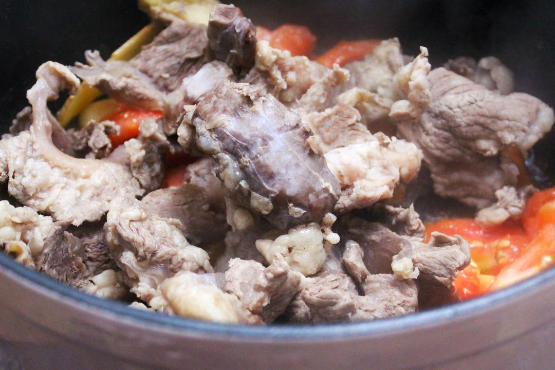 倒入能没过食材的热水,大火烧开后,放入白胡椒粒、干辣椒、香叶,盖上转小火炖煮60—90分钟左右。 —期间注意留心观察、避免水分耗干,如果中途需要加水,要加热水,但最好还是在一开始就把水量加够。 —此时的肉筋应该已经变软,只是还不够软糯。如果筋很硬,可以延长炖煮时间。 —白胡椒粒适合炖煮,和番茄在一起尤其搭配,吃起来辣辣的,很暖。黑胡椒碎则适合在做菜后期或做好以后撒上提鲜。
