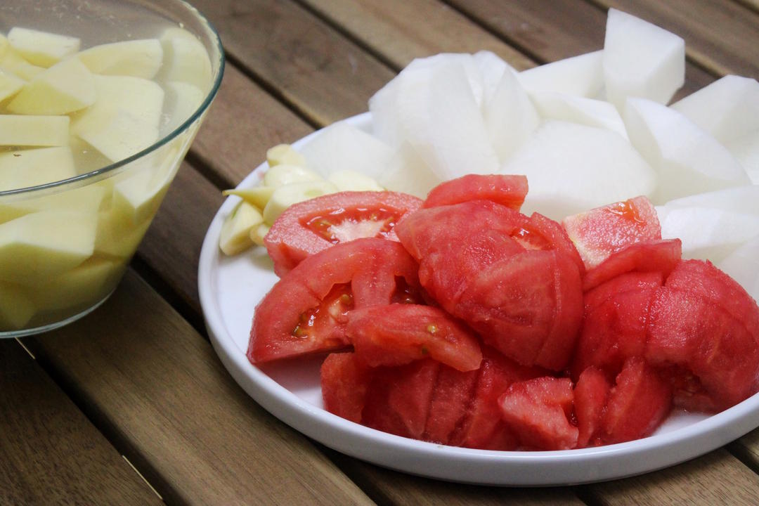 飞水的同时处理其他食材:番茄、萝卜/土豆分别去皮、切成大块。 —土豆去皮后要用清水泡着,避免氧化变色。 —如果想偷懒,番茄皮也可以不去,炖煮后可以很轻松的挑出来。