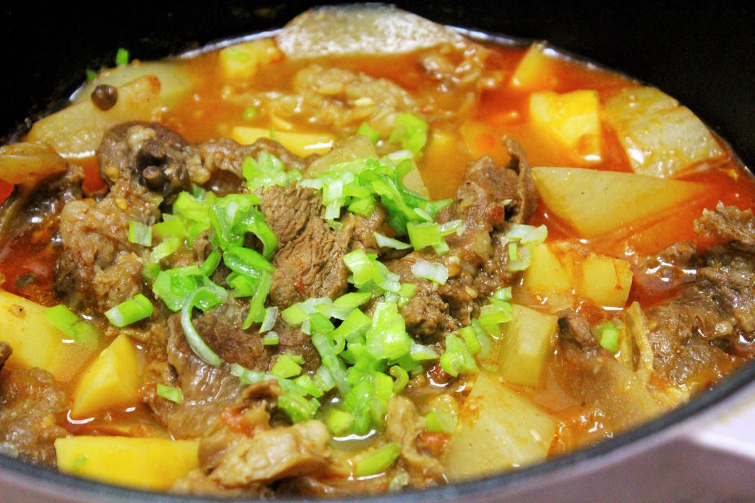 加适量盐、和黑胡椒碎调味,放入切块的萝卜或土豆,继续炖煮30分钟至软烂。如果剩余水分较多,可以去掉盖子,大火略微收浓即可。 —一定不要把汤汁收没,用来泡饭煮面都超棒,记得把表面的浮油撇一下就好了。