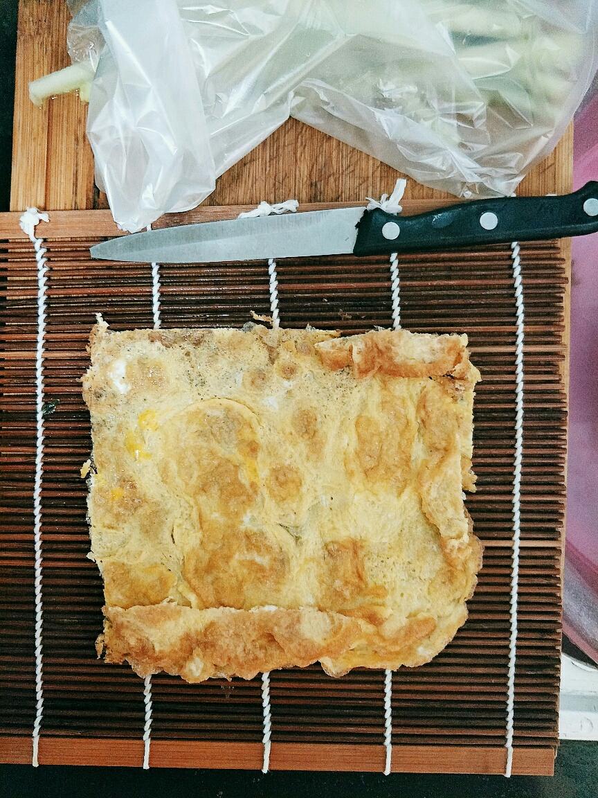 盖上保鲜袋,轻轻压平,让饭与鸡蛋饼贴和