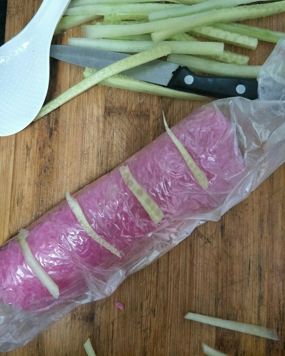 放入黄瓜条,火腿肠条