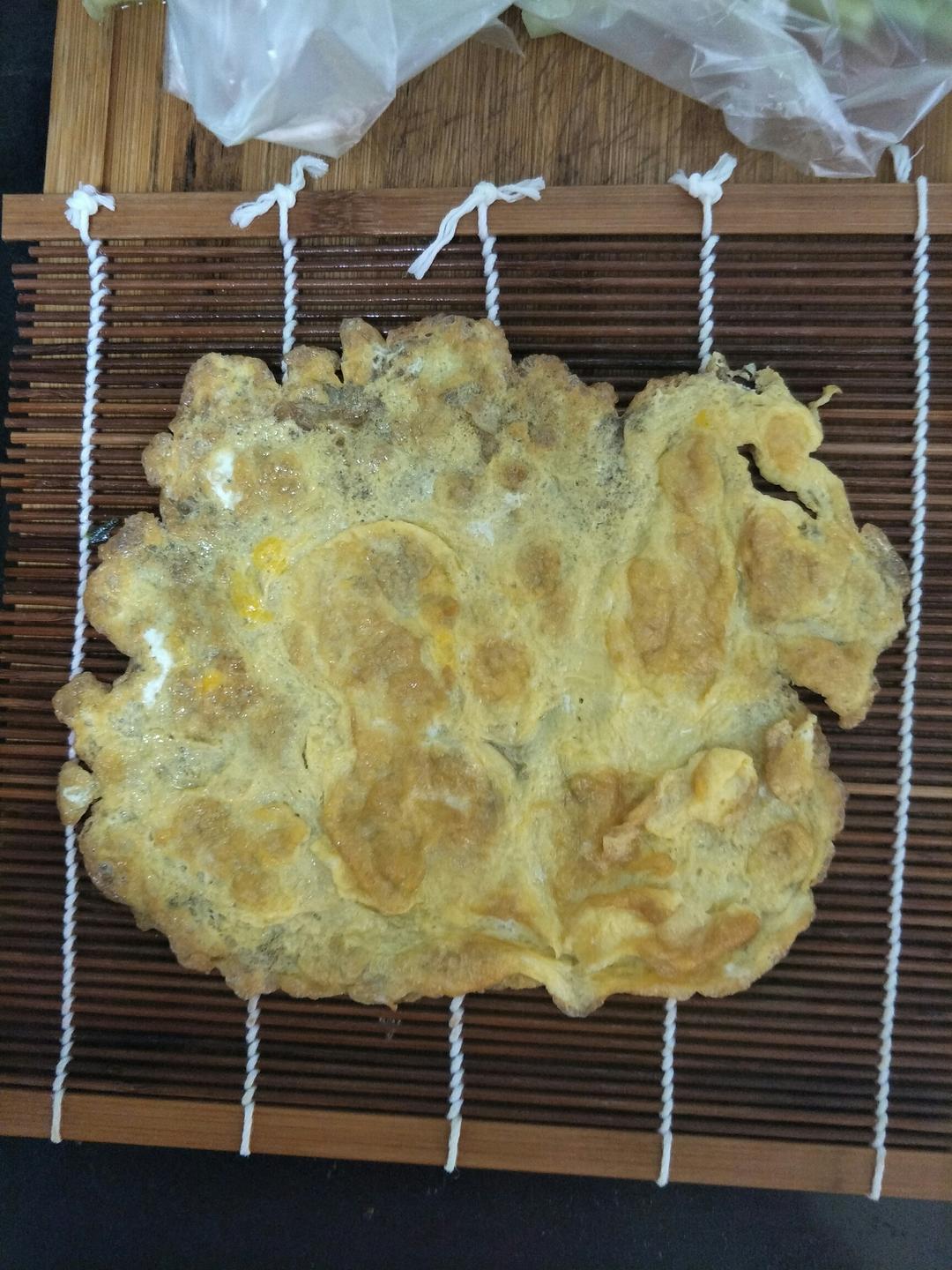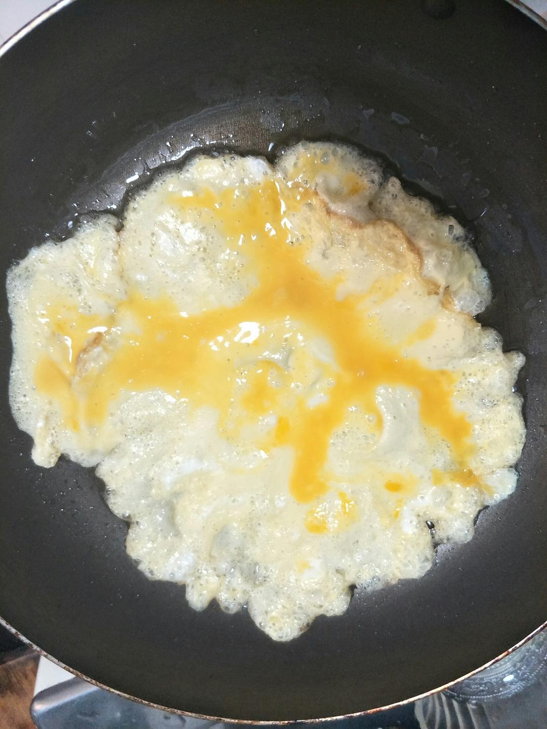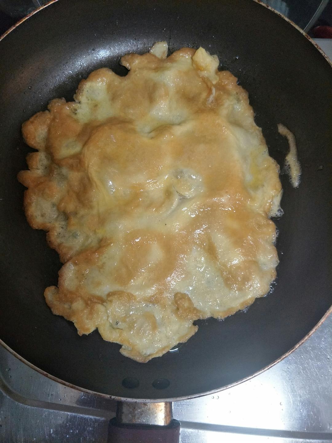 锅里放入少量油,把蛋液倒入,摊开,