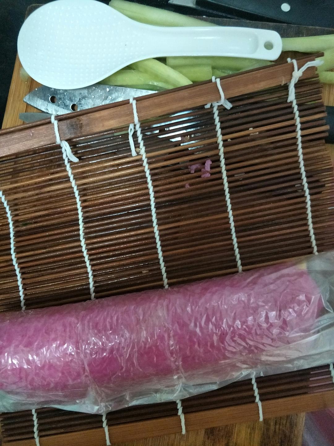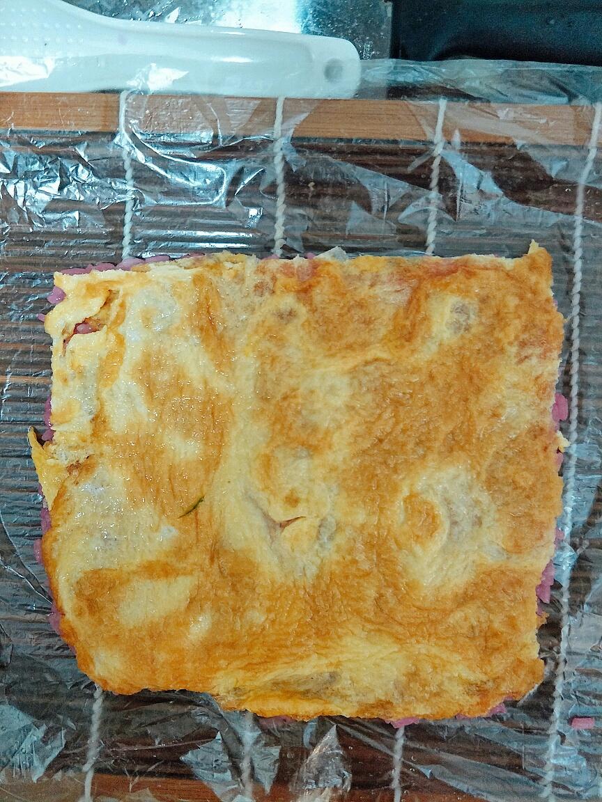 把红心火龙果拌好的饭扑到鸡蛋饼上,摊平