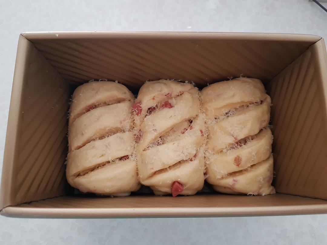 其实材料可以随意放自己喜欢的,好像这个,我底部白色的是芝士酱,撒点肉松,然后就是香肠,培根,洋葱,帕马森芝士,然后直接卷上,然后切开两边交叉扭叠整形放吐司模。 快捷整形。