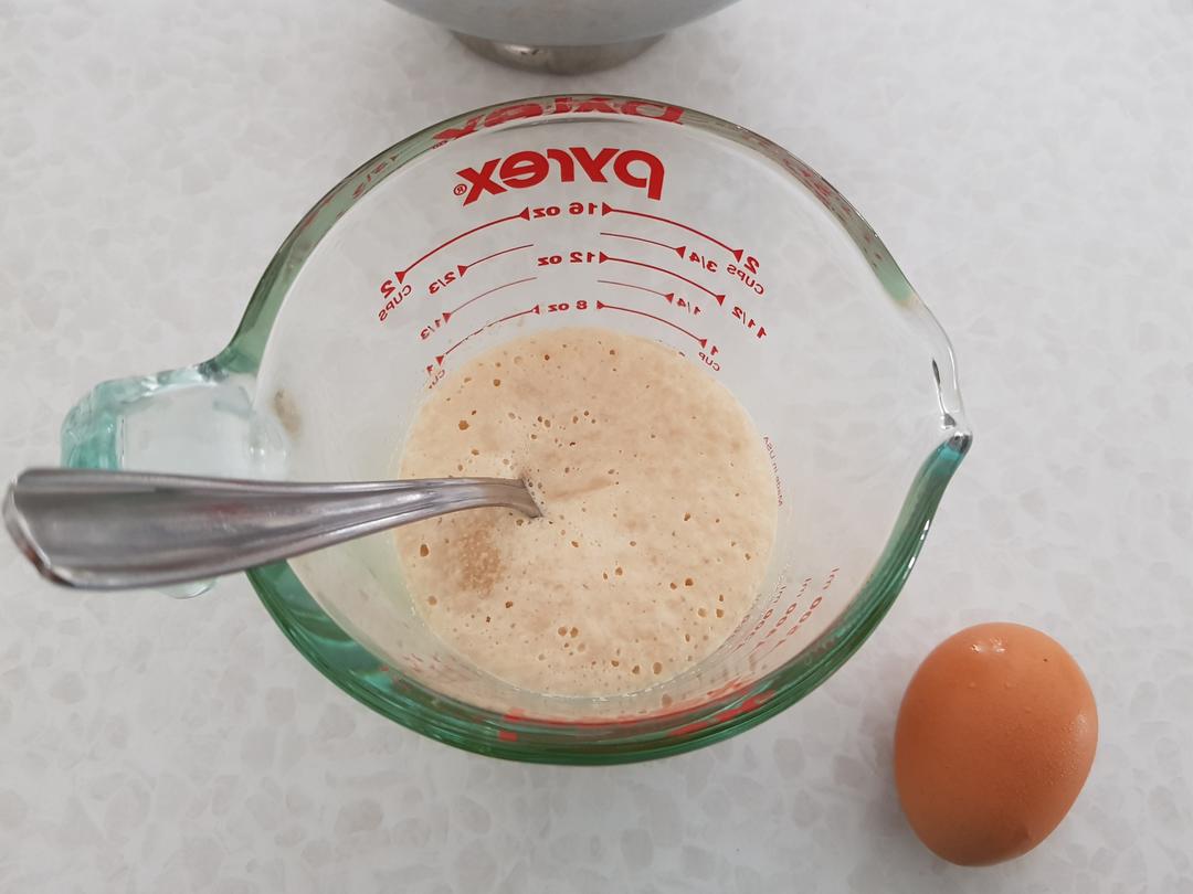 静止几分钟激活酵母,(如果夏天太热可直接放冰牛奶和奶油全部放面粉里揉,省去加热)