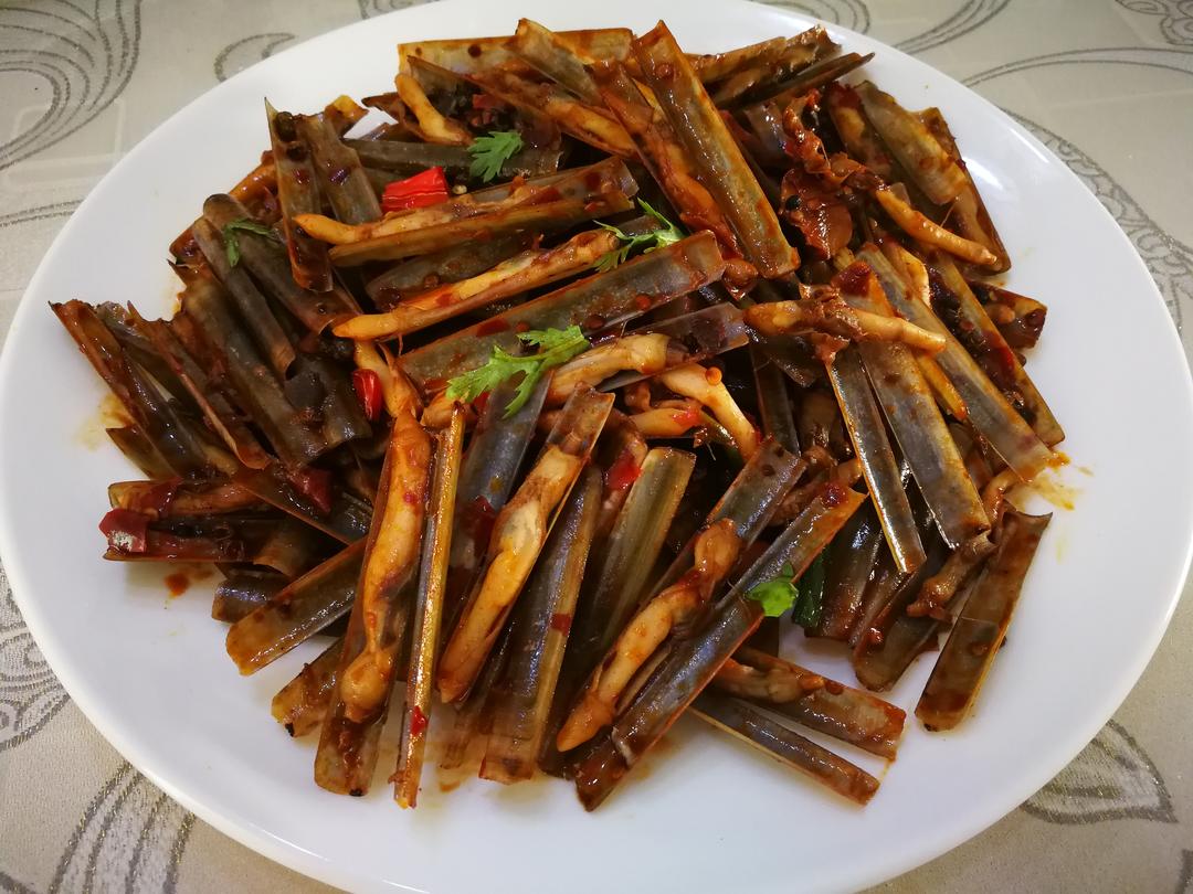 1.炒锅热油,放入洋葱、蒜片、姜片爆香 2.继续放入麻椒、红椒、郫县辣酱,中火翻炒,放入糖一勺,海鲜酱油适量,盐少许,(郫县辣酱本来就咸,盐是平常炒菜的三分之一,少放) 3.炒出红油的功夫适量放入一些水,搅匀,倒入控过水的竹节蛏,翻炒,迅速翻炒,动作要轻盈,迅速,会颠炒勺的更好,动作越轻盈,蛏子皮越完整,总之,铲子把蛏子皮铲破了,吃起来会很磕碜。 4.出锅,切好的香菜撒上,点缀即可。