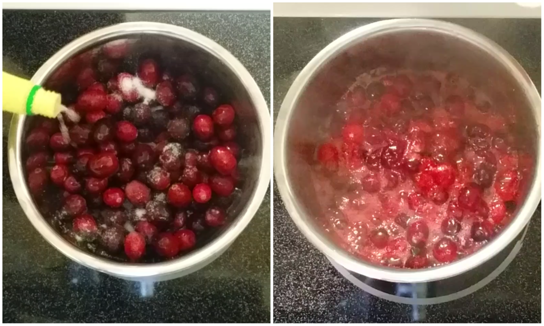在烤蛋白的2个小时里,做蔓越莓酱。把新鲜的蔓越莓倒入锅里,加入白砂糖和柠檬汁。煮沸,并继续煮掉部分水分,直至蔓越莓软化。