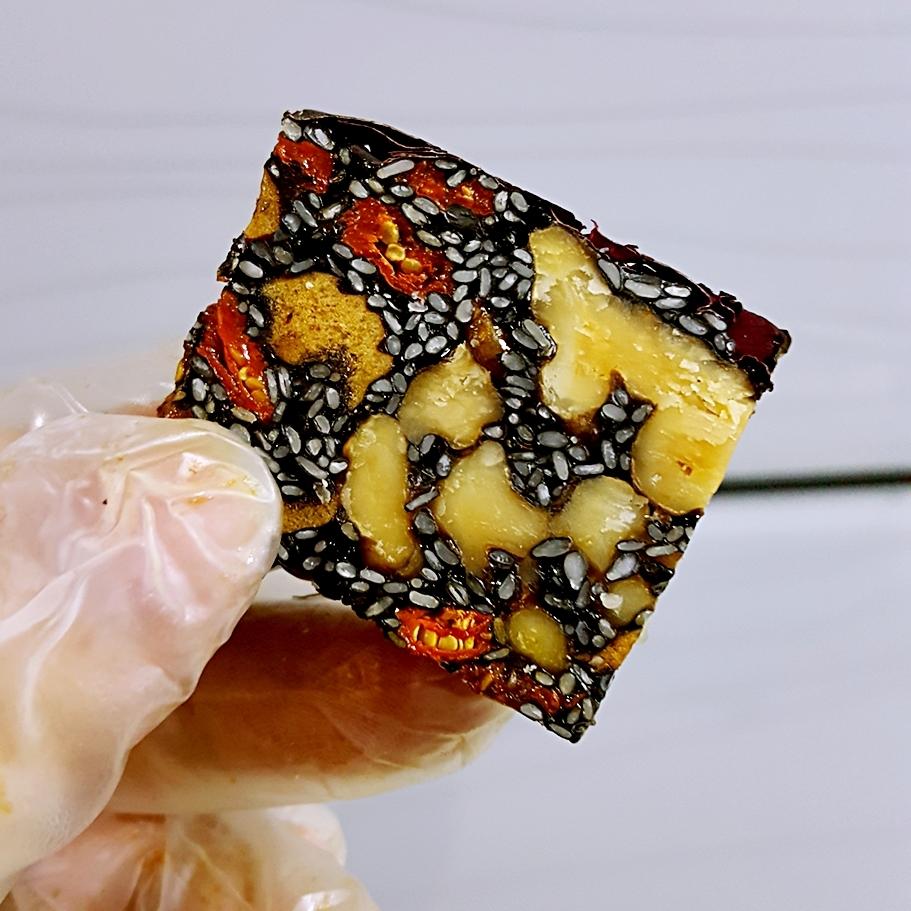 加红枣拌匀后再加核桃。🖤加料时可以关火也可以保持小火。🖤除芝麻外的辅料可以一起倒进去,也可以逐一倒入,我喜欢一种一种加,拌匀后再加另一种,而且我觉得核桃加太早会不会就不那么香了。。。