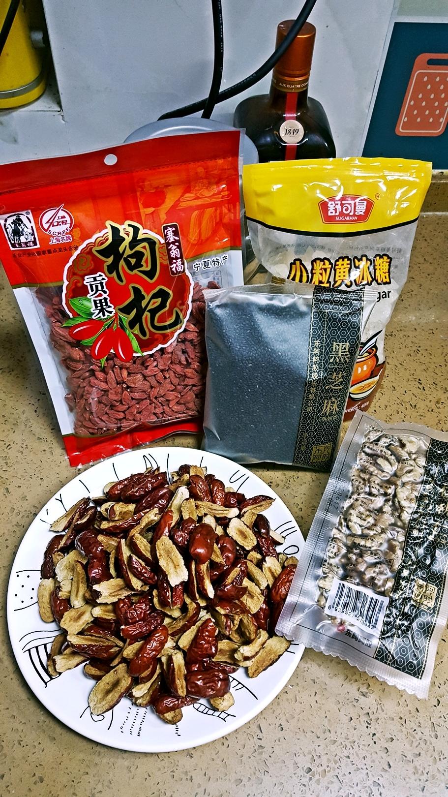 一天半以后,准备好材料。免洗大枣剪肉。枸杞也是用免洗的。芝麻核桃都是东阿送的辅料包,没有用送的单晶冰糖更喜欢土冰糖。🖤非要洁癖的人就想洗的都洗洗,然后一定要晾干,一定要干。🖤不用单晶冰糖是因为单晶冰糖没有中医说的冰糖的药用功效。但是东阿送的就是单晶冰糖。。。🖤大块土冰糖粉碎大法:微波炉叮一分钟左右,时间看大小块增减,别化了就成。叮好后轻轻一敲,分分钟碎成渣。
