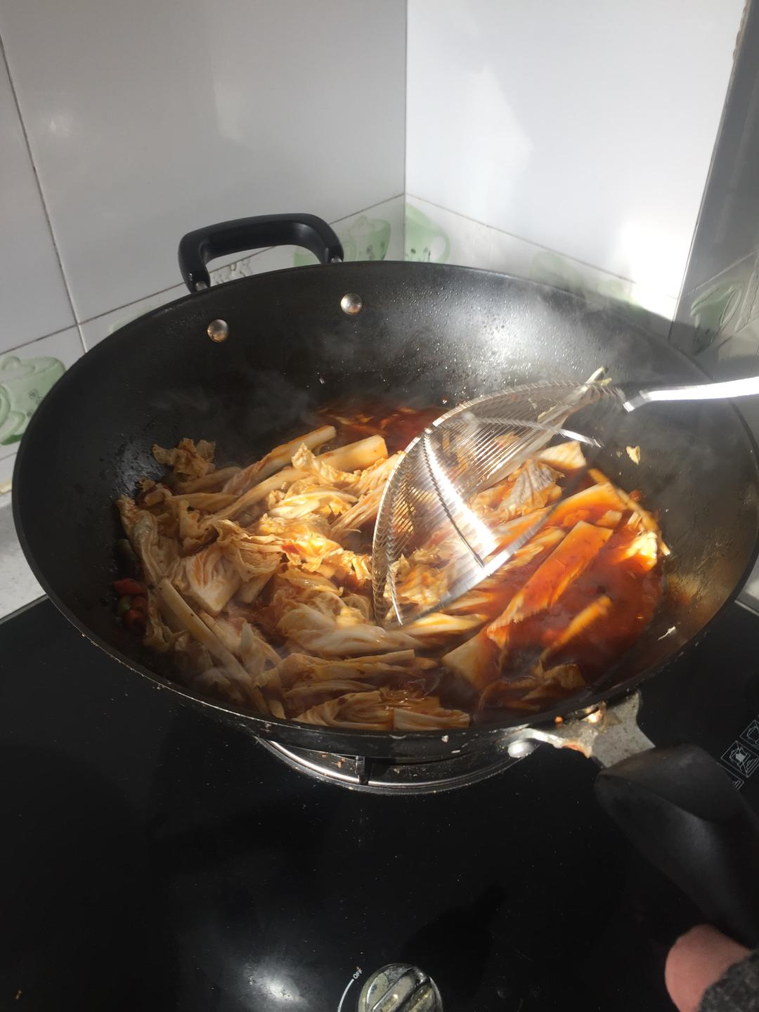 捞出羊蝎子后,煮白菜,要多煮一会,到软烂