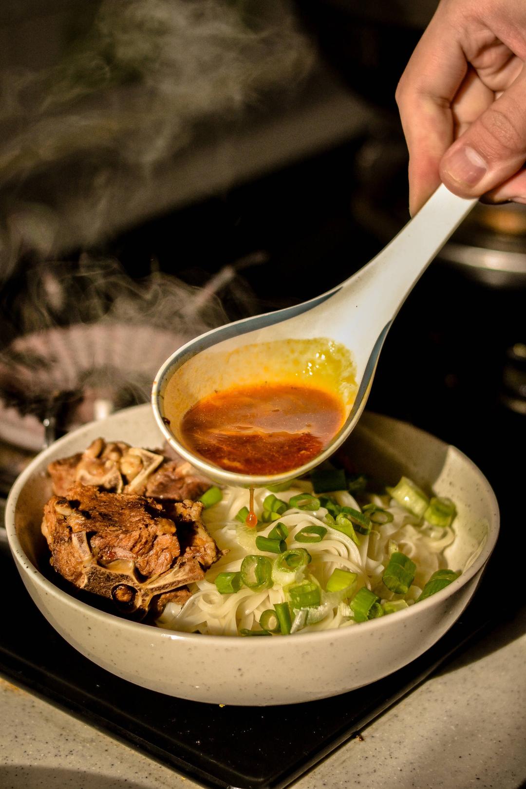 煮完后捞出,把羊蝎子放在面上,撒葱花