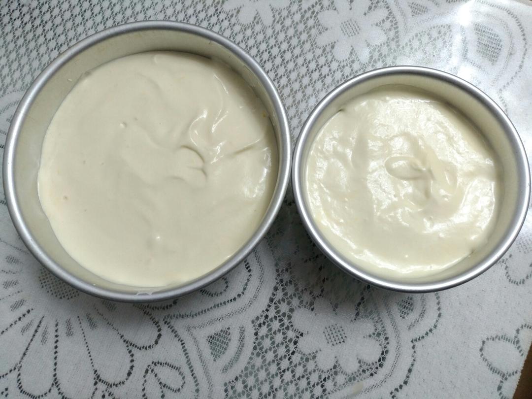 分别倒入8寸和6寸活底模具中,入烤箱,上下火130度烤30分钟,再150度烤30分钟。