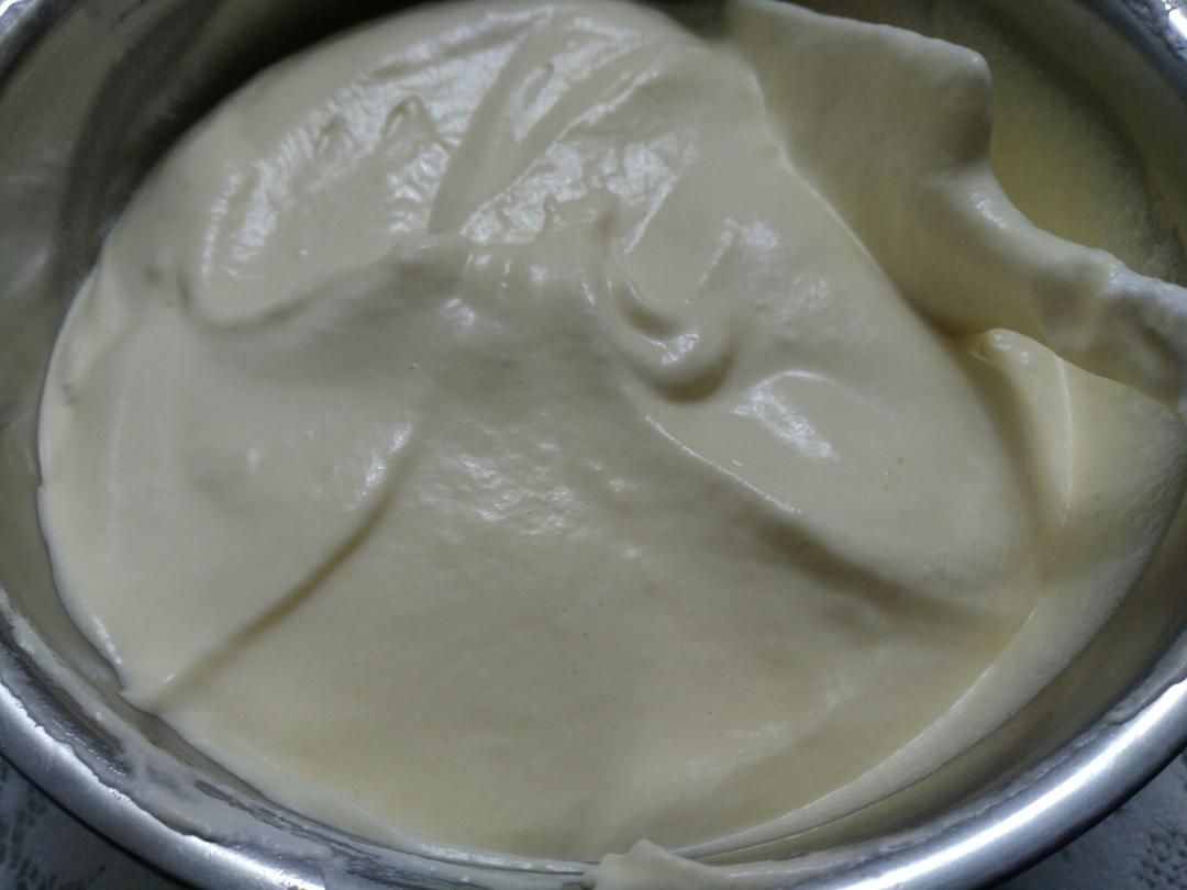 用手动打蛋器把蛋黄糊搅拌均匀(同样不能画圈式搅拌),然后用刮刀沿着盆壁刮一圈,把面糊整理好。