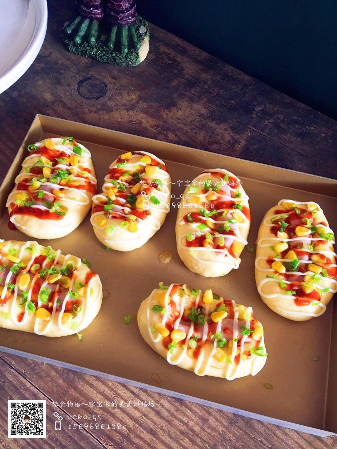 在涂了蛋液的面包上按自己喜欢撒上葱花火腿和玉米粒,将沙拉酱放入裱花袋中