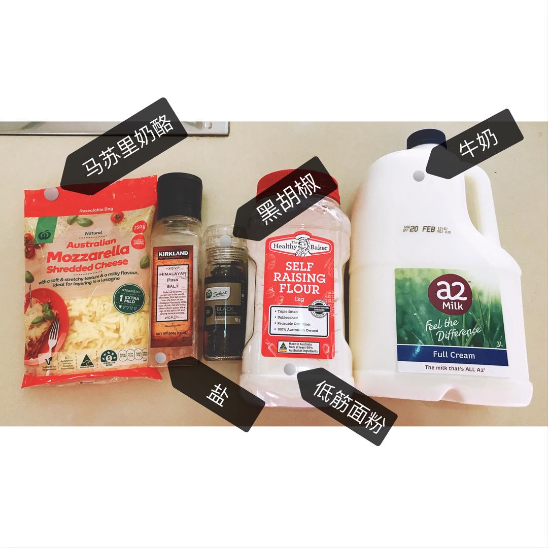 材料如上(忘记把黄油放进去拍了) 马苏里奶酪已经是丝状,再切得碎一些成细屑最好。 将奶酪屑、低筋面粉、黑胡椒粉、盐、牛奶、以及室温融化的黄油搓成松散状。(黄油也可以微波炉转30秒成半融化状。) 加入牛奶揉成一个面团。