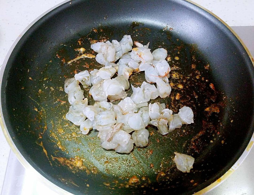 炒出虾油后丢弃虾头,倒入虾仁丁翻炒。