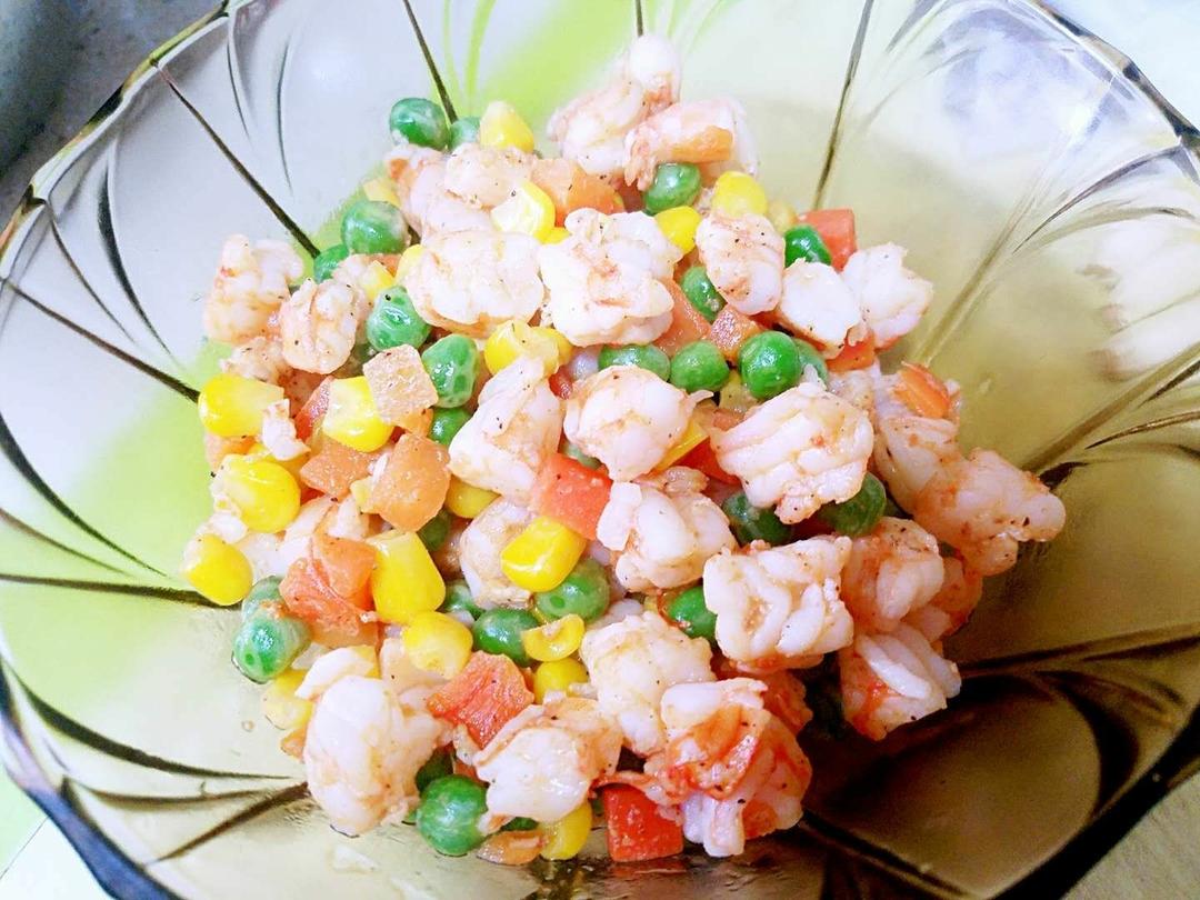 虾仁略微变色后就下蔬菜粒一起翻炒。