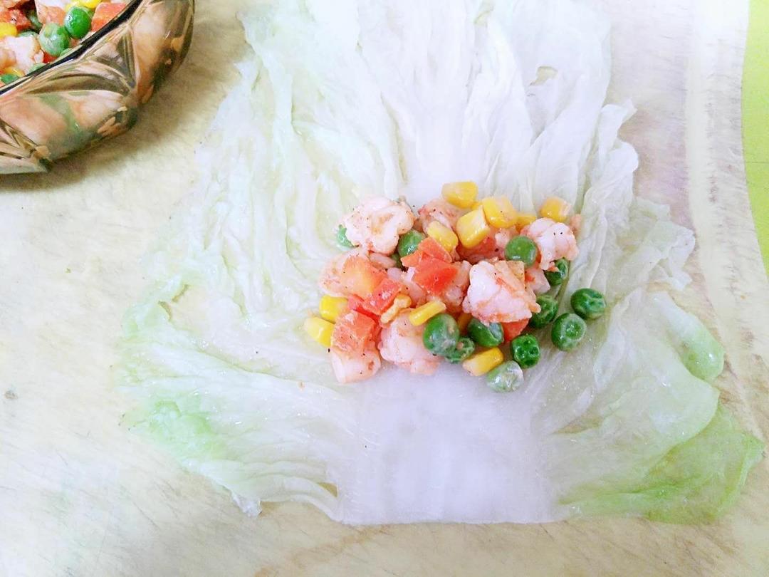 铺一勺烫软的白菜叶子,挖一坨炒好的馅放在靠近底部的位置,馅可以多一点,会比较好吃。