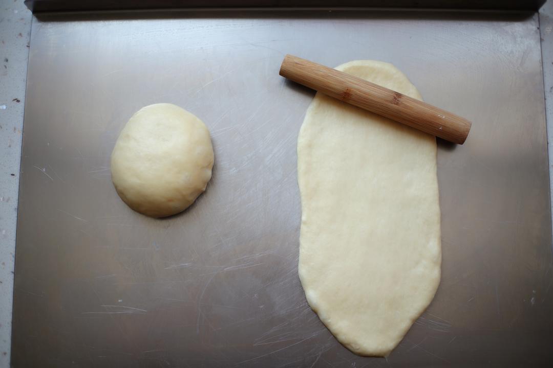 将松弛好的面团擀开~这时候开始预热烤箱,上下火180度~