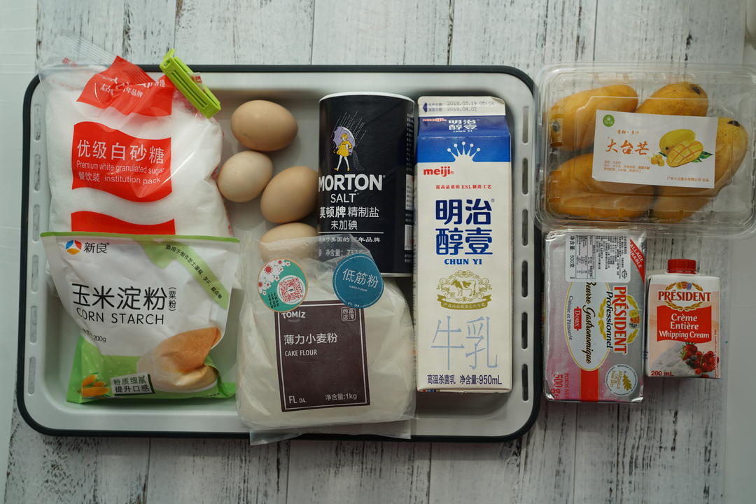 取出冰箱里的卡仕达酱,倒入芒果泥。