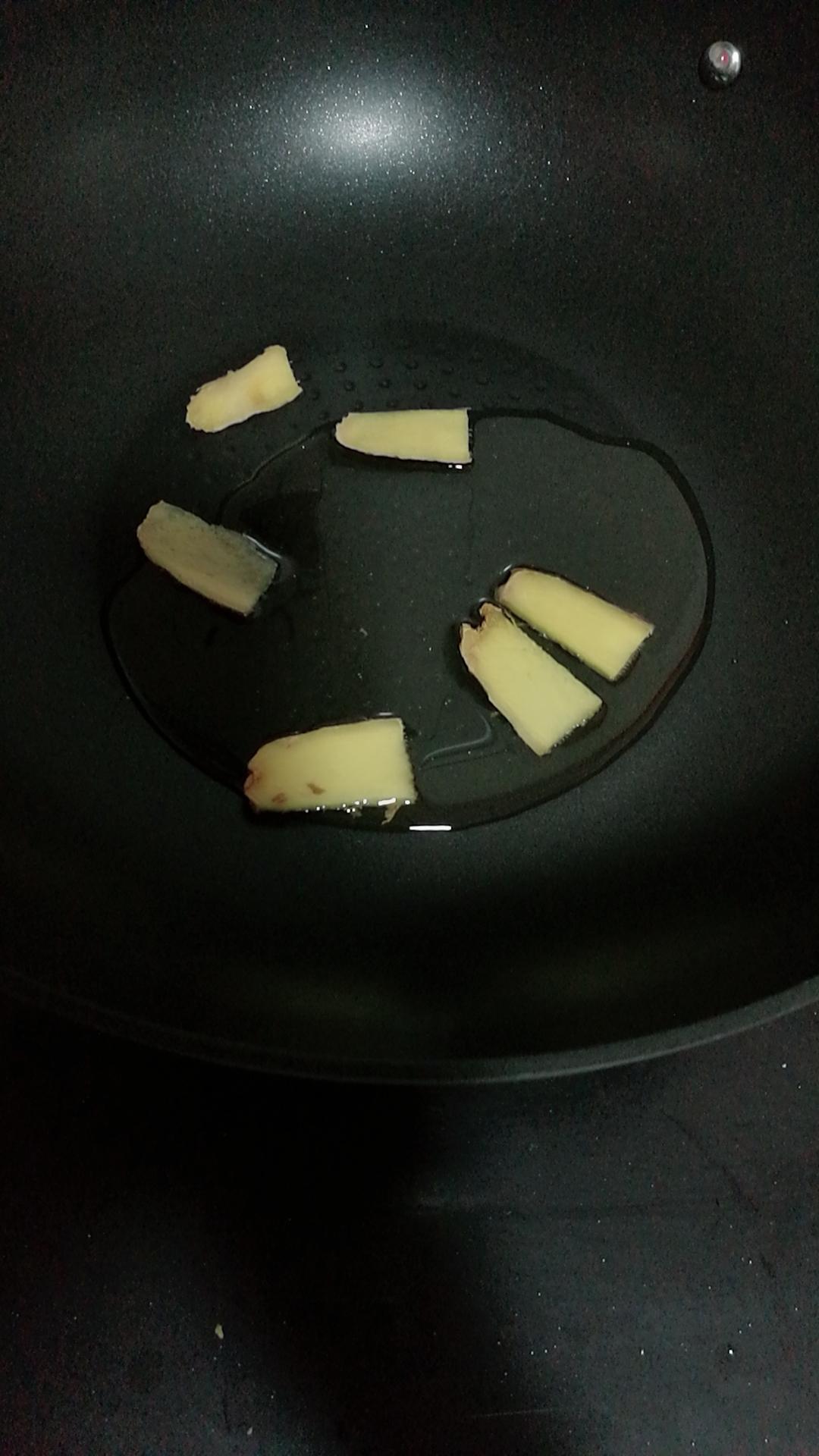 热油热锅下姜片,用姜片擦一擦锅底防粘,还是不粘锅好用,我用的是不粘锅,也会下姜片,去腥!