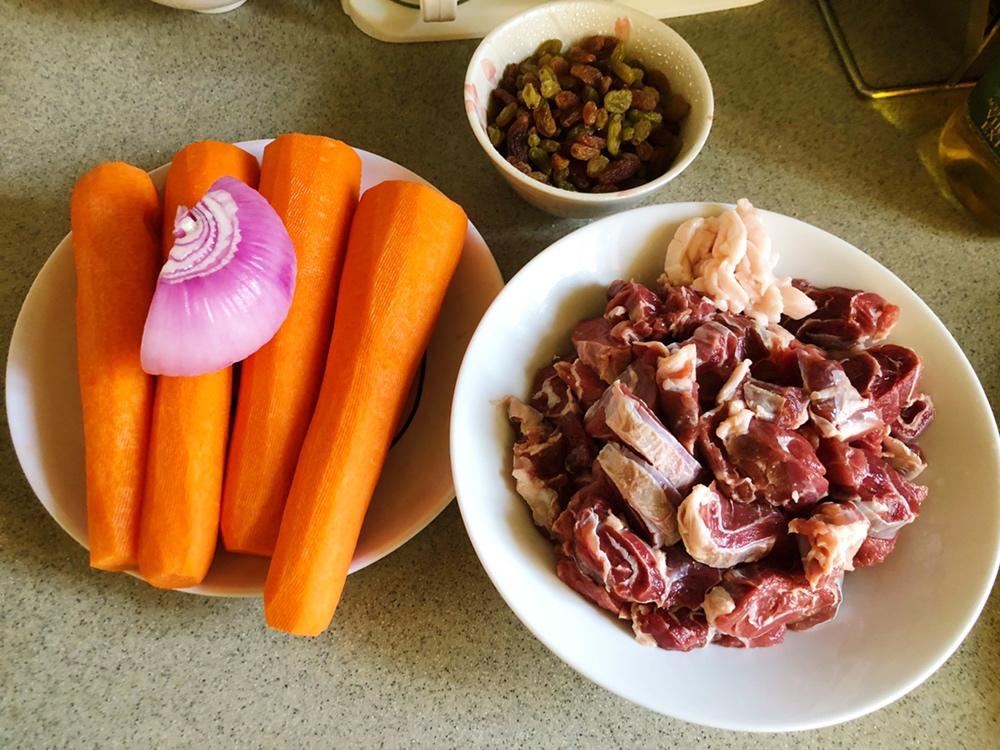 1、羊肉切块(不能太小,3cm左右),胡萝卜切成手指粗的长条,洋葱切粗丝,葡萄干洗干净。 2、锅内放油(比炒菜油略多),放进羊肉块翻炒,等羊肉的水分快炒干时,羊肉会开始出油,放入洋葱继续翻炒,炒出洋葱香味后加入盐(如果有小朋友吃,可以加点热水让羊肉小火焖煮一会儿,这样羊肉烧的更烂),然后撒孜然粉。 3、炒羊肉的同时另起油锅煸炒胡萝卜条,加一点点盐炒至胡萝卜发软(想只用一口锅的话,就在炒肉之前先把胡萝卜炒好备用)。 4、将胡萝卜倒入羊肉锅内继续翻炒。 5、提前淘好大米,大米浸泡半小时。 6、在电饭锅内先放入炒好的羊肉洋葱胡萝卜,然后铺入泡好的米,抹平不要搅拌,水位正好漫过米,略微超过即可。 7、电饭煲启动正常的煮饭程序(我家是日本背回来的电饭煲,要煮将近1个小时)。 8、煮饭程序还剩15分钟时,揭开锅盖,撒上洗干净的葡萄干,盖好继续煮。煮饭程序结束后,让电饭煲再焖几分钟,然后开锅上下搅拌均匀,香喷喷的羊肉抓饭就做好了。