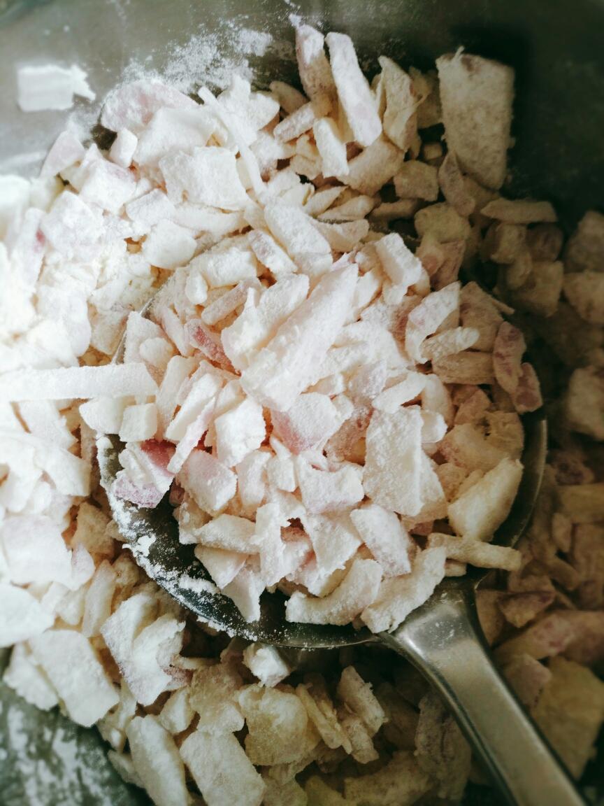 抖去多余面粉,油温八成热下大铁锅炸。转中小火。
